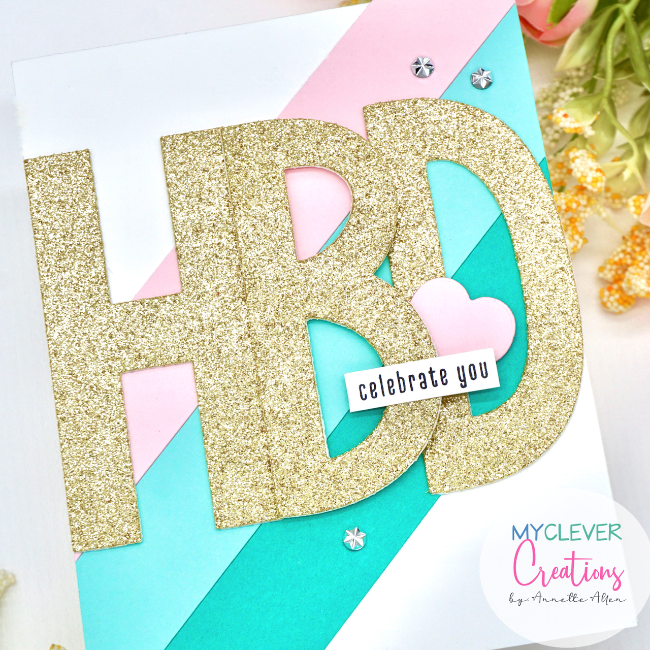 Die cut the HBD die on gold glitter cardstock. Adhere the H and the D first using liquid glue, add some foam tape to the back of the B and adhere it in the center. I used a ruler at the bottom so I was able to line it up.